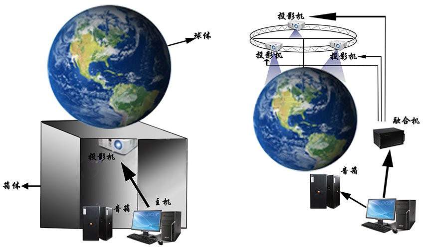 球幕投影系統(tǒng)是一種新興的展示技術(shù),它打破了以往投影圖像只能是平面規(guī)則圖形的局限。系統(tǒng)通過投影與邊緣融合技術(shù)相結(jié)合,能夠在一個球體表面上顯示出連續(xù)無縫隙全方位的影像,使整個產(chǎn)品體現(xiàn)出極其科技感、立體感、震撼的視覺效果,并能保證畫面不變形,畫質(zhì)清晰,色彩艷麗。球幕投影主要分為內(nèi)投球和外投球。